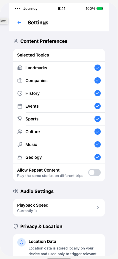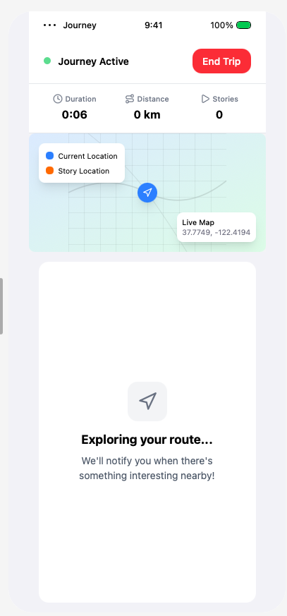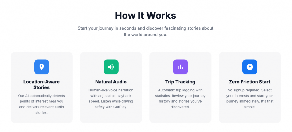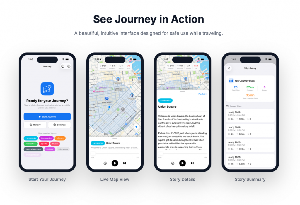 - The app would then provide a short lesson/insight on each of these POI’s dynamically generated in a story form.